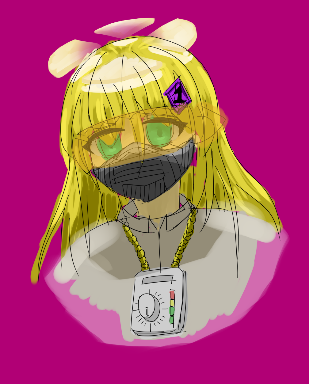 金发碧眼小女孩,头上有光盘,可以从分成几瓣的光盘以及每一瓣的颜色来知晓她此刻的心情。在左侧前发上带有紫色的发卡。